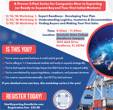 A Proven 3-Part Series for Companies New to Exporting (or Ready to Expand Beyond Your First Initial Markets) 2/16, 2/23, & 3/2