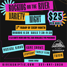 Join us for an exciting evening on the water as we set sail on Lake Monroe and the St. Johns River for a variety-packed night of entertainment! Play Musical Bingo and compete in thrilling game shows like Jeopardy, Family Feud, Trivia, and more, or hit the dance floor and dance your heart out in a lively, interactive atmosphere.